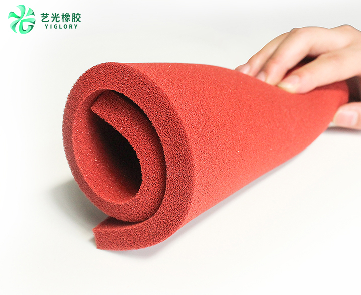 硅橡膠開孔海綿的形成:以高透氣性聚氨酯軟質(zhì)海綿載體,采用浸膠擠壓工藝,將液體硅橡膠包覆在所有高透氣性聚氨酯軟質(zhì)海綿所有經(jīng)絡上,硫化后,再經(jīng)過二次硫化,使內(nèi)部的聚氨酯海綿破壞,制成具有高透氣性的硅橡膠開孔海綿,該材料使用溫度范圍為-60-250℃,平均孔徑范圍為1.5mm-0.2mm。