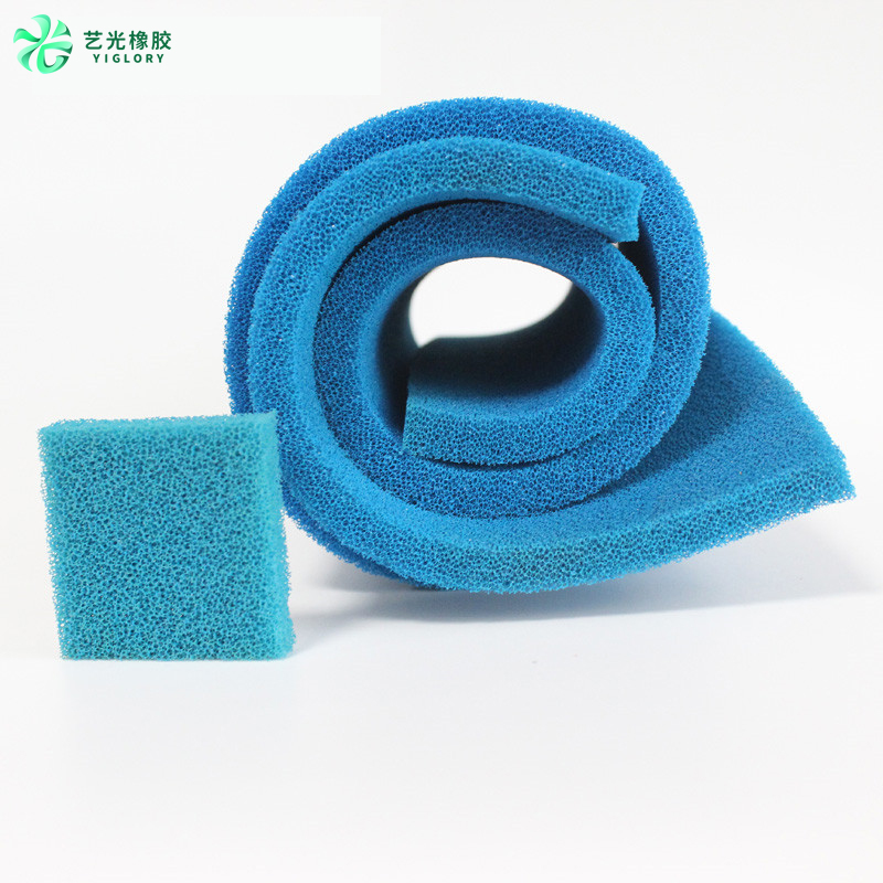 硅橡膠開孔海綿的形成:以高透氣性聚氨酯軟質(zhì)海綿載體,采用浸膠擠壓工藝,將液體硅橡膠包覆在所有高透氣性聚氨酯軟質(zhì)海綿所有經(jīng)絡(luò)上,硫化后,再經(jīng)過二次硫化,使內(nèi)部的聚氨酯海綿破壞,制成具有高透氣性的硅橡膠開孔海綿,該材料使用溫度范圍為-60-250℃,平均孔徑范圍為1.5mm-0.2mm。